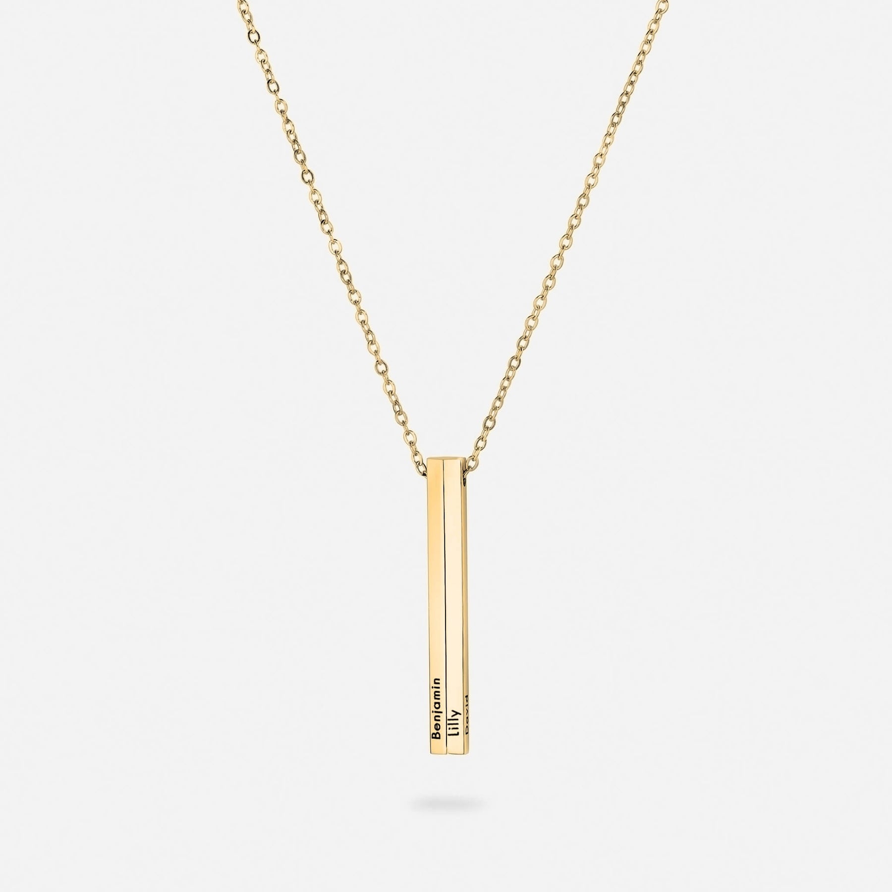 The Vertical Name Necklace can be personalised on up to five sides with names, dates, or words that hold deep significance — creating a timeless symbol of connection, loyalty, and strength.